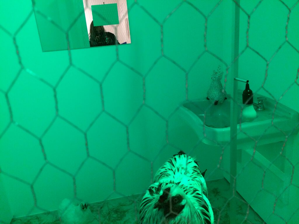 In der Ausstellung „Surrealist Intrusion in the Enchanters‘ Domain“ (Surrealistisches Eindringen in die Domäne der Zauberei) mit Hasengitter, drei weißen lebendigen Hühnern, 77 One- Cent Münzen und grünem Licht (1960/61, D’Arcy Galeries, NEw York)