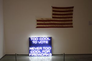 In der Ausstellung „Surrealist Intrusion in the Enchanters‘ Domain“ (Surrealistisches Eindringen in die Domäne der Zauberei) mit Hasengitter, drei weißen lebendigen Hühnern, 77 One- Cent Münzen und grünem Licht (1960/61, D’Arcy Galeries, NEw York)