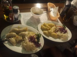 This evening was quite short. We had a big menu, soup, pierogies, salad and french fries. Pommes we would say….And bear. Of course. It was very cheap. We payed less than 10 Euros each for everything. In Zloty round about 40.